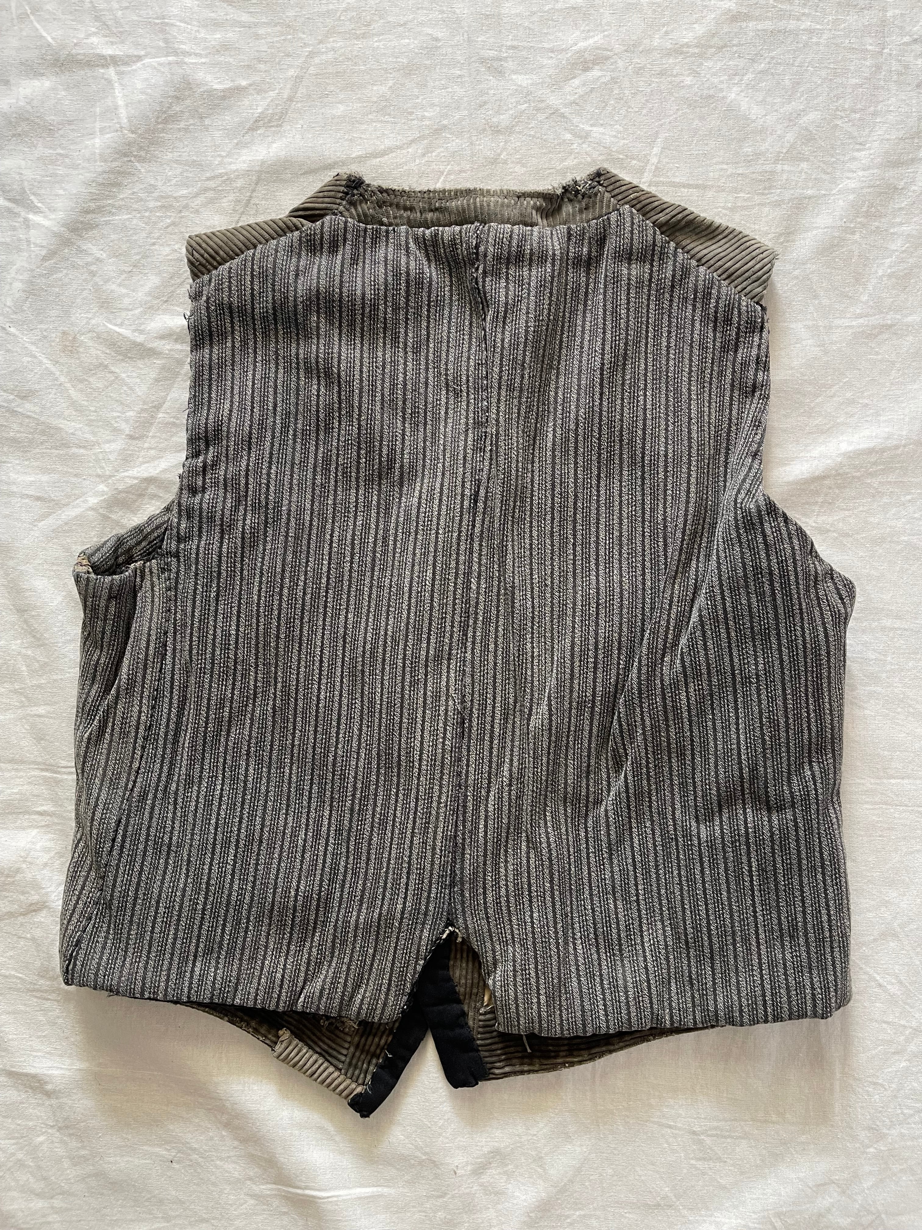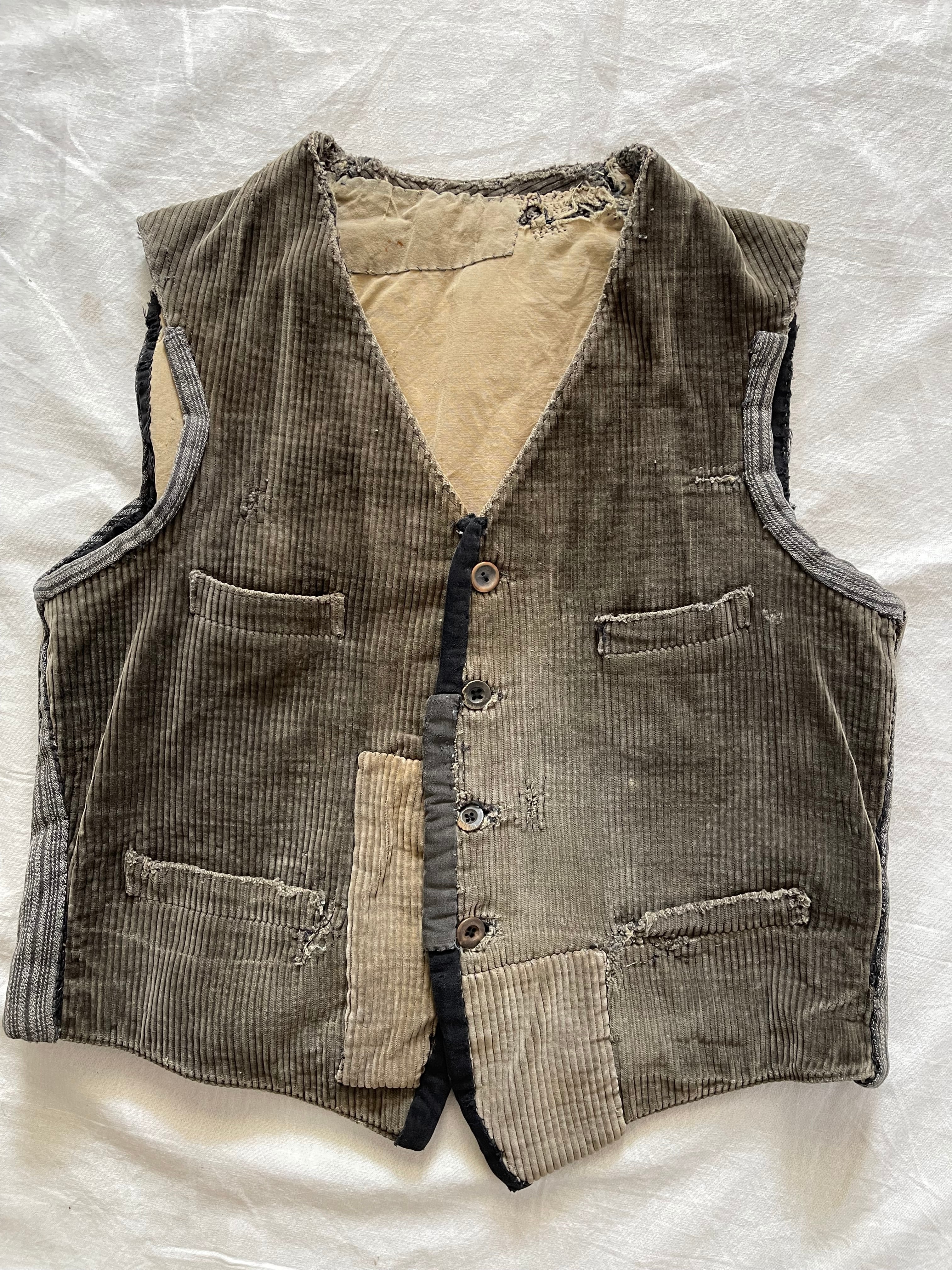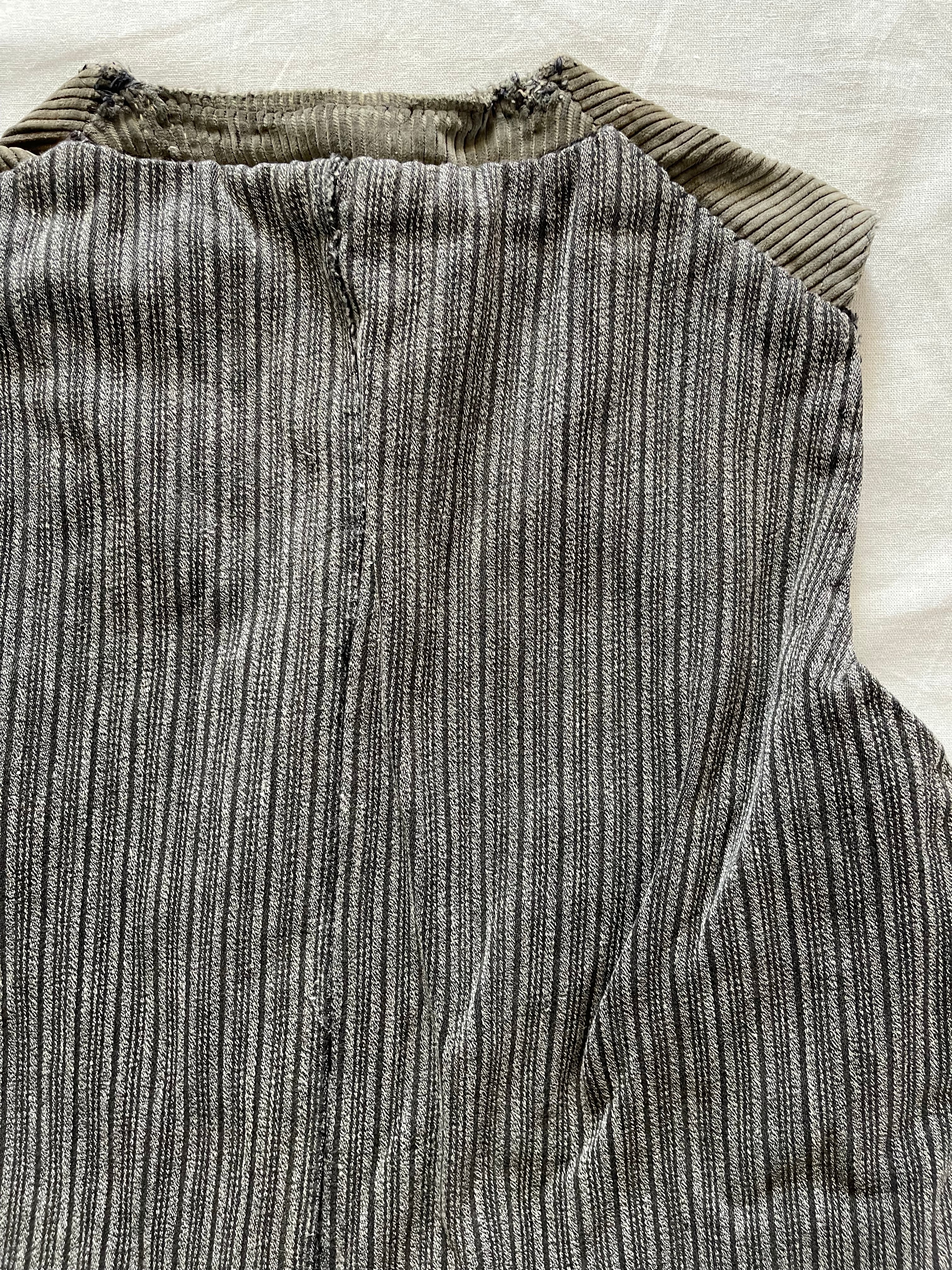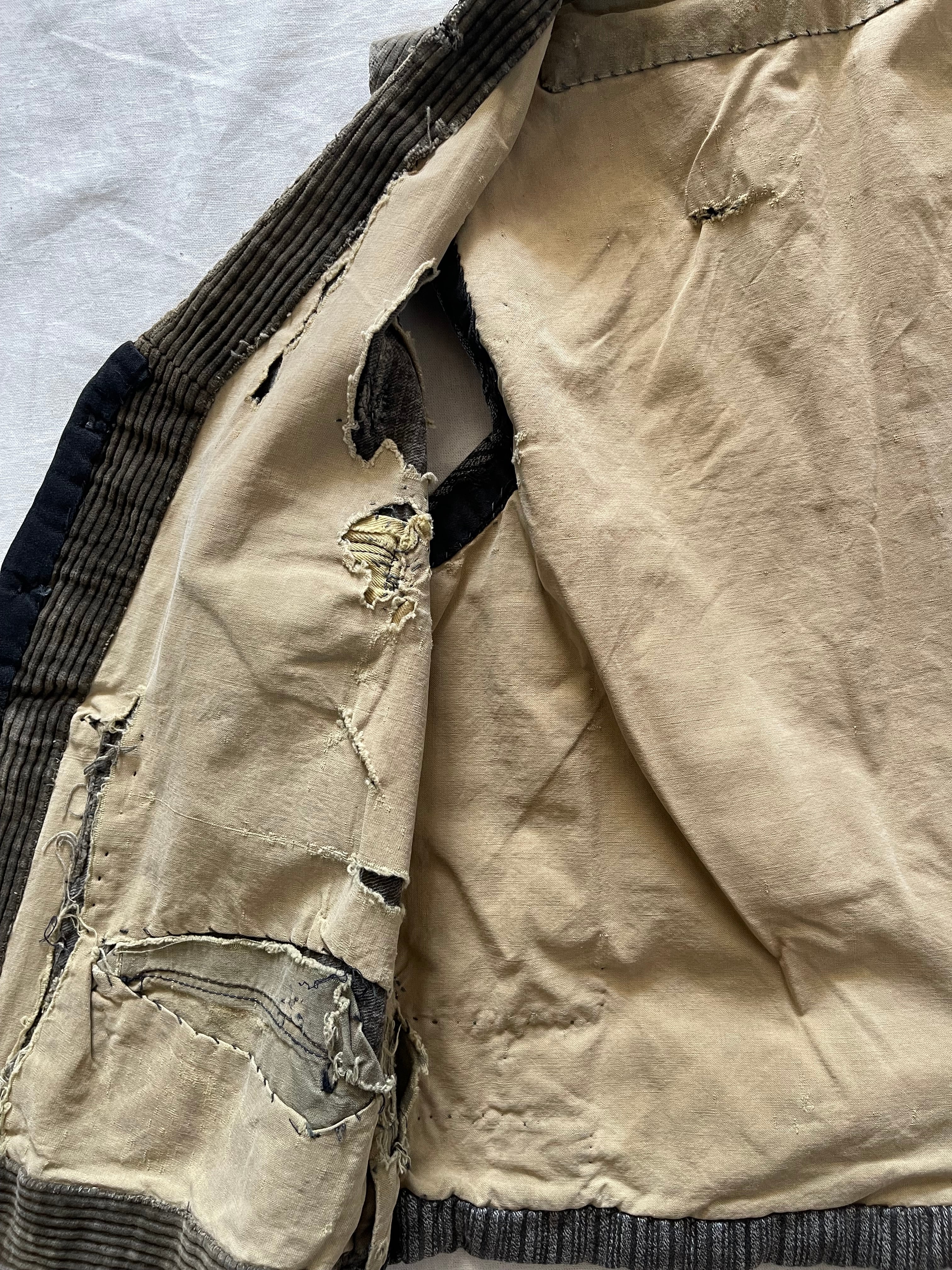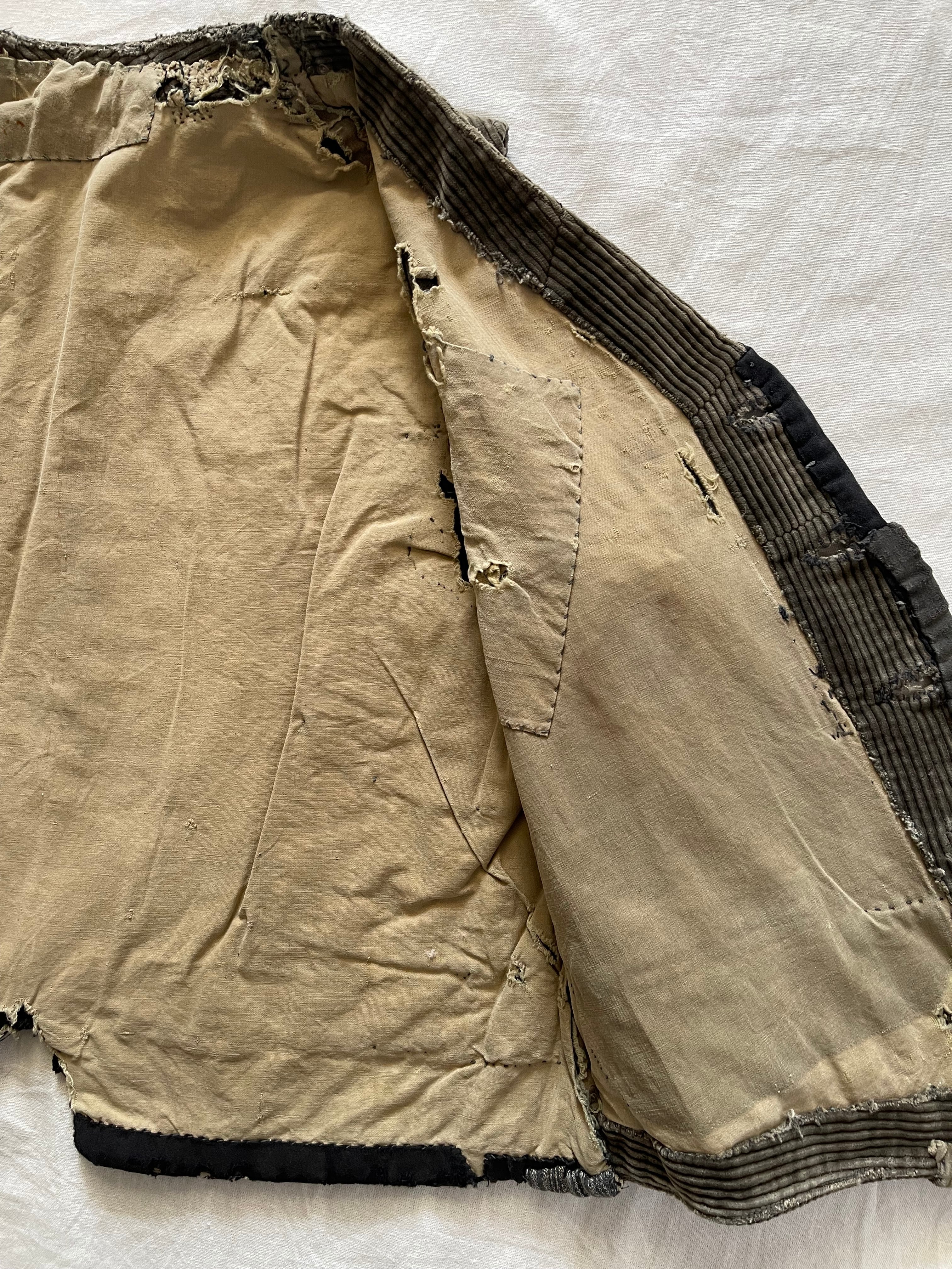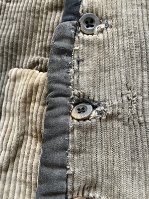 エイジングされたブラウンカラー、太畝のコーデュロイです。ボタンは木ボタン。ブラックモールスキンやシャンブレーの生地でリペアされており、大切に使われていた個体かと思います。