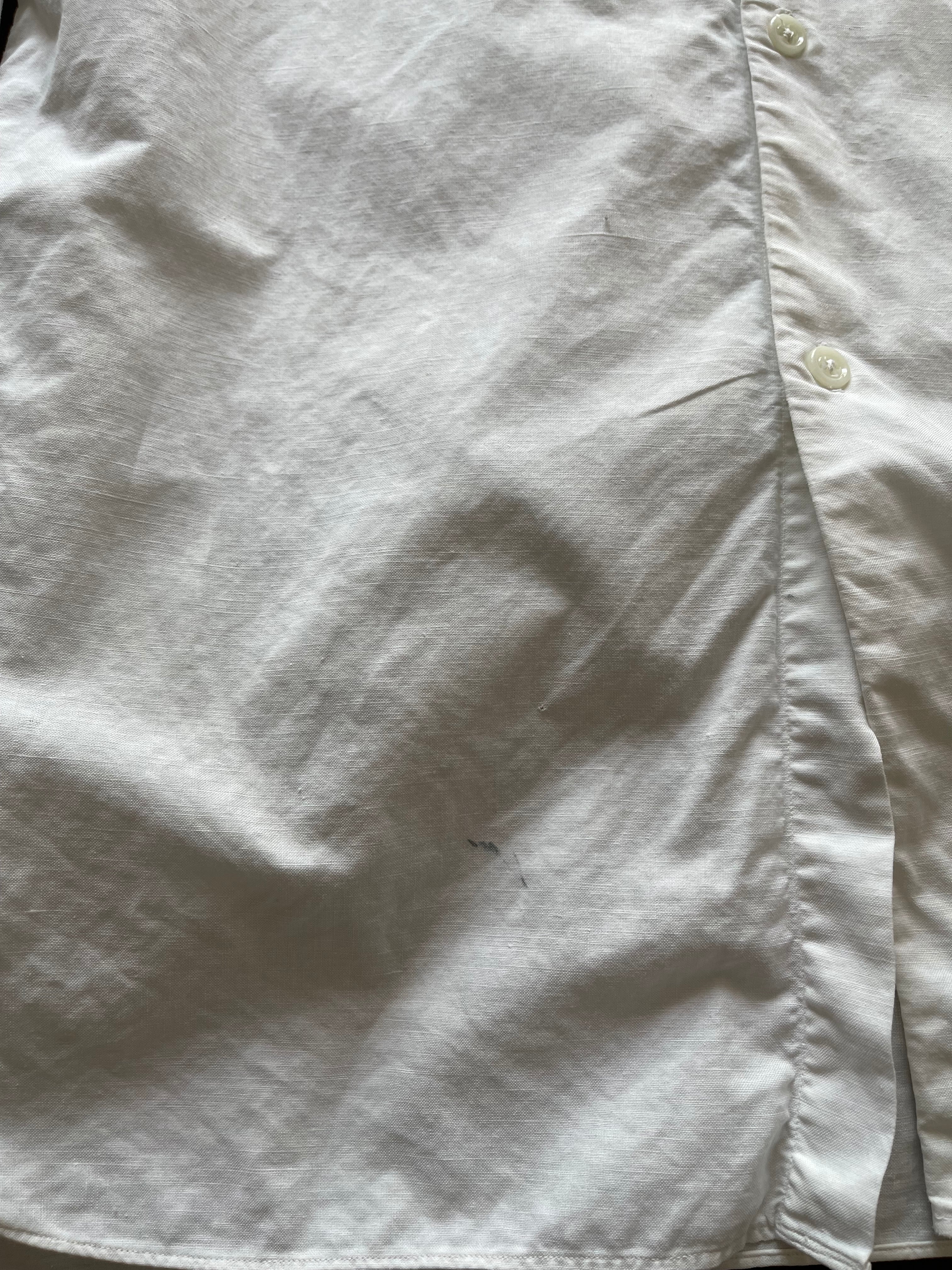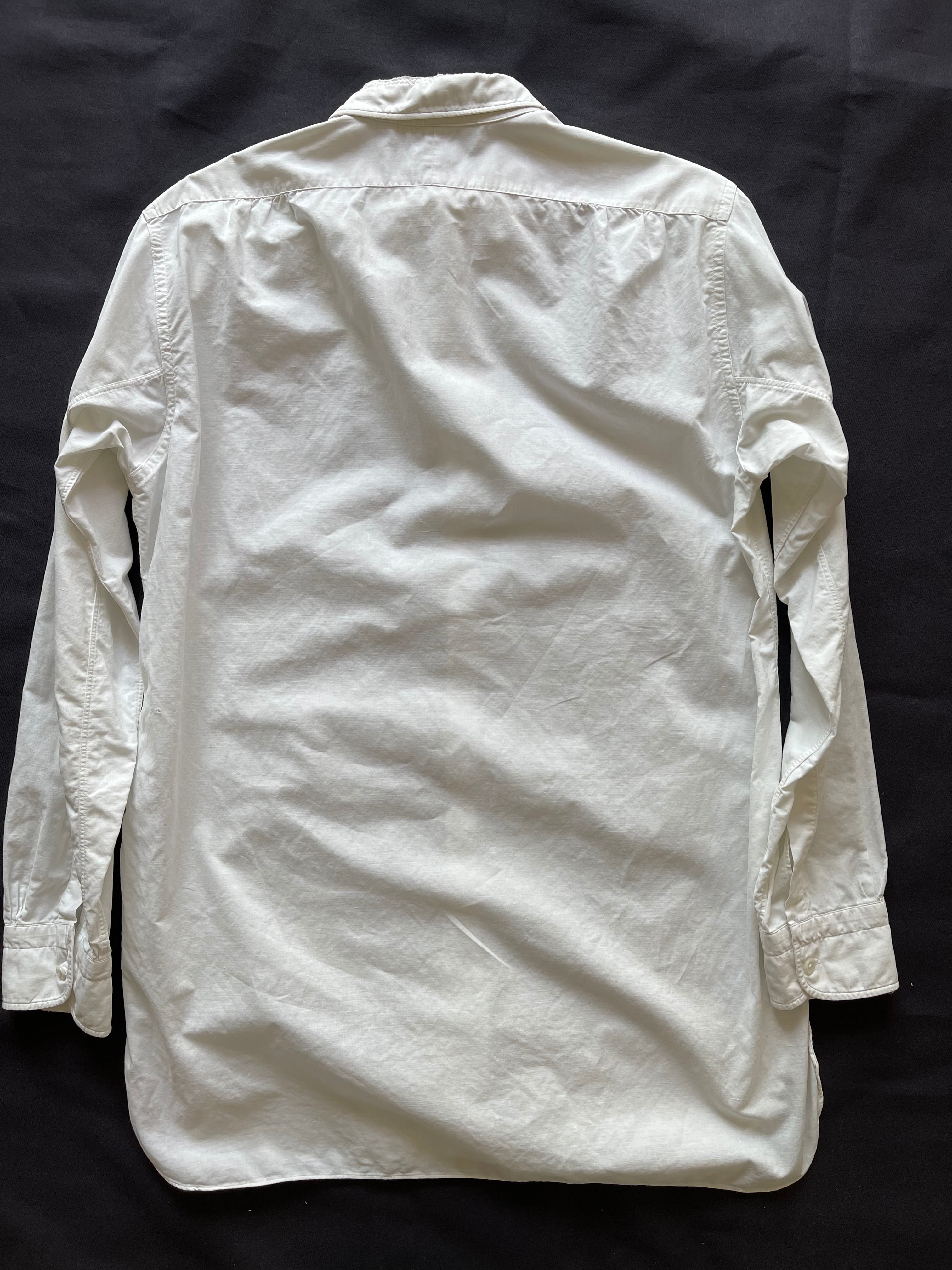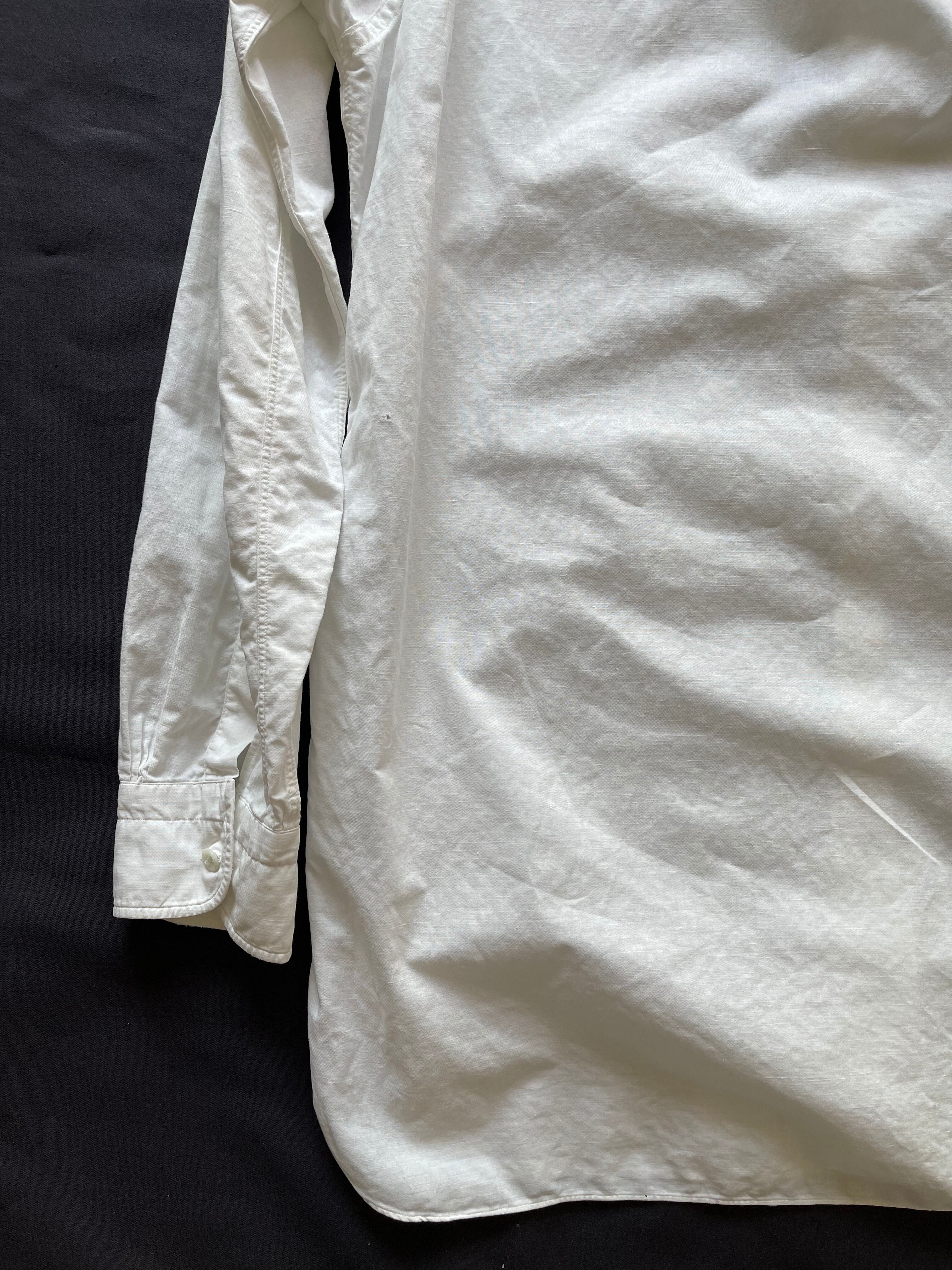 小ぶりな襟やガラスボタン、古いシャツによくあるディティール。