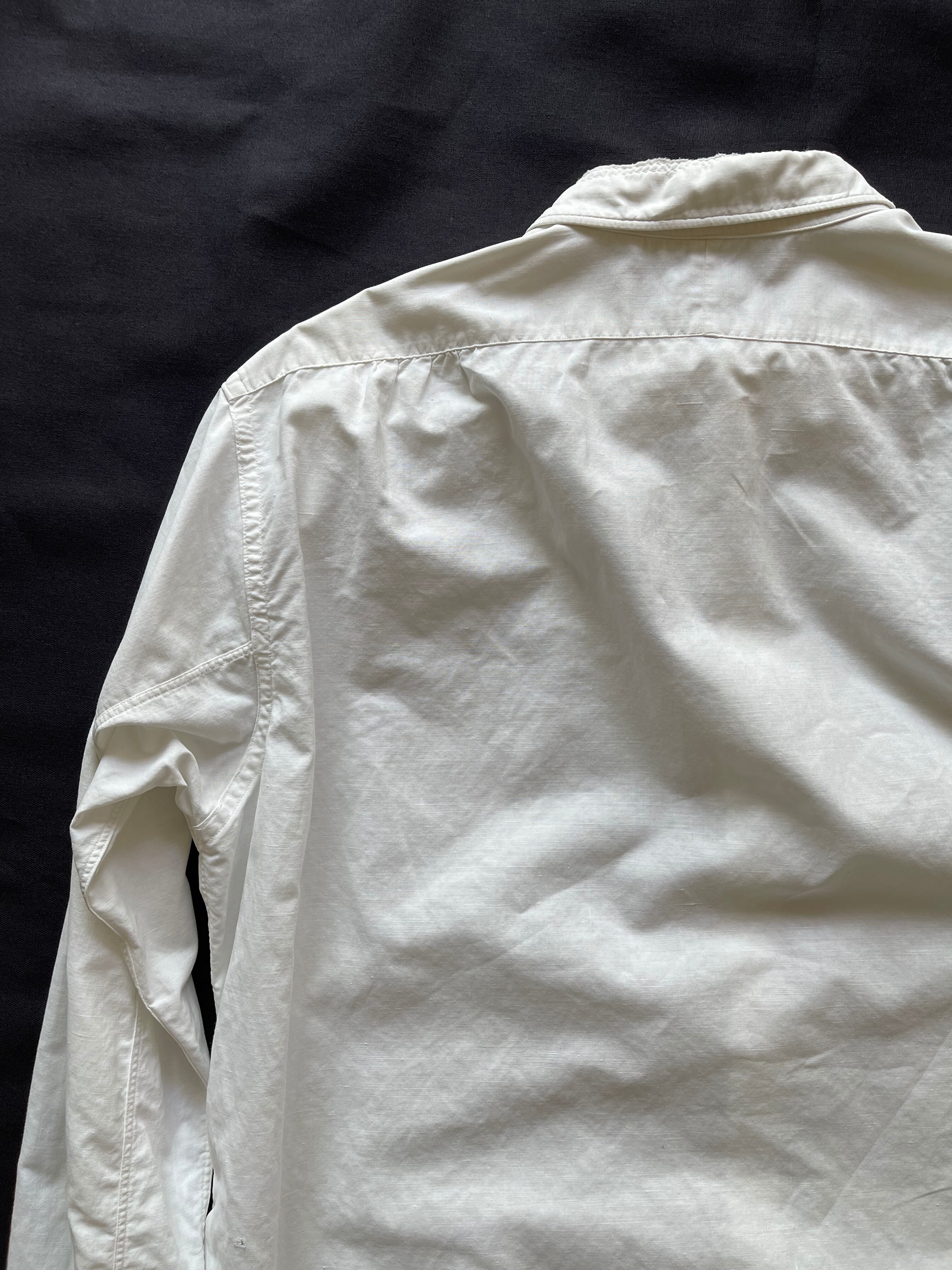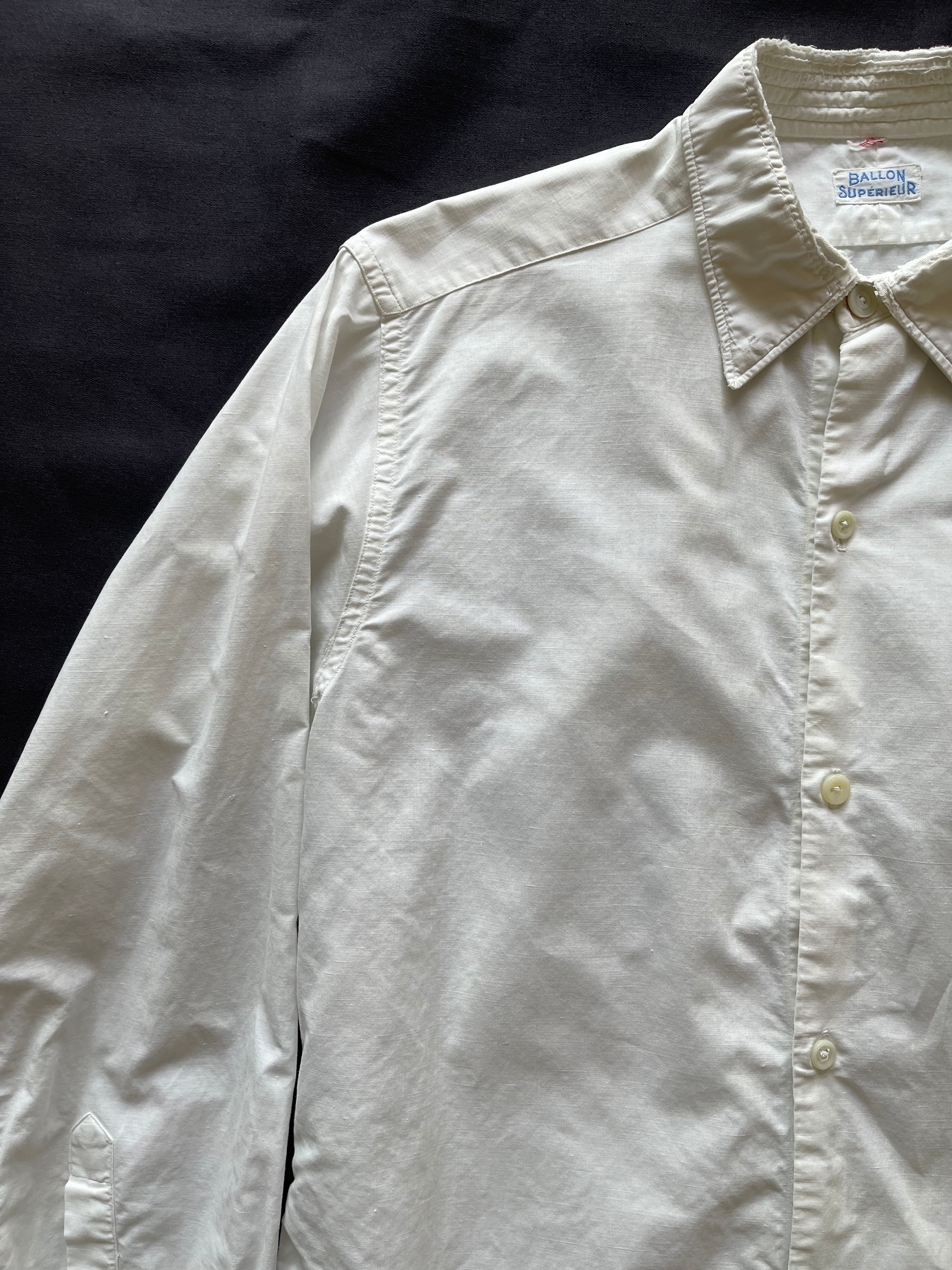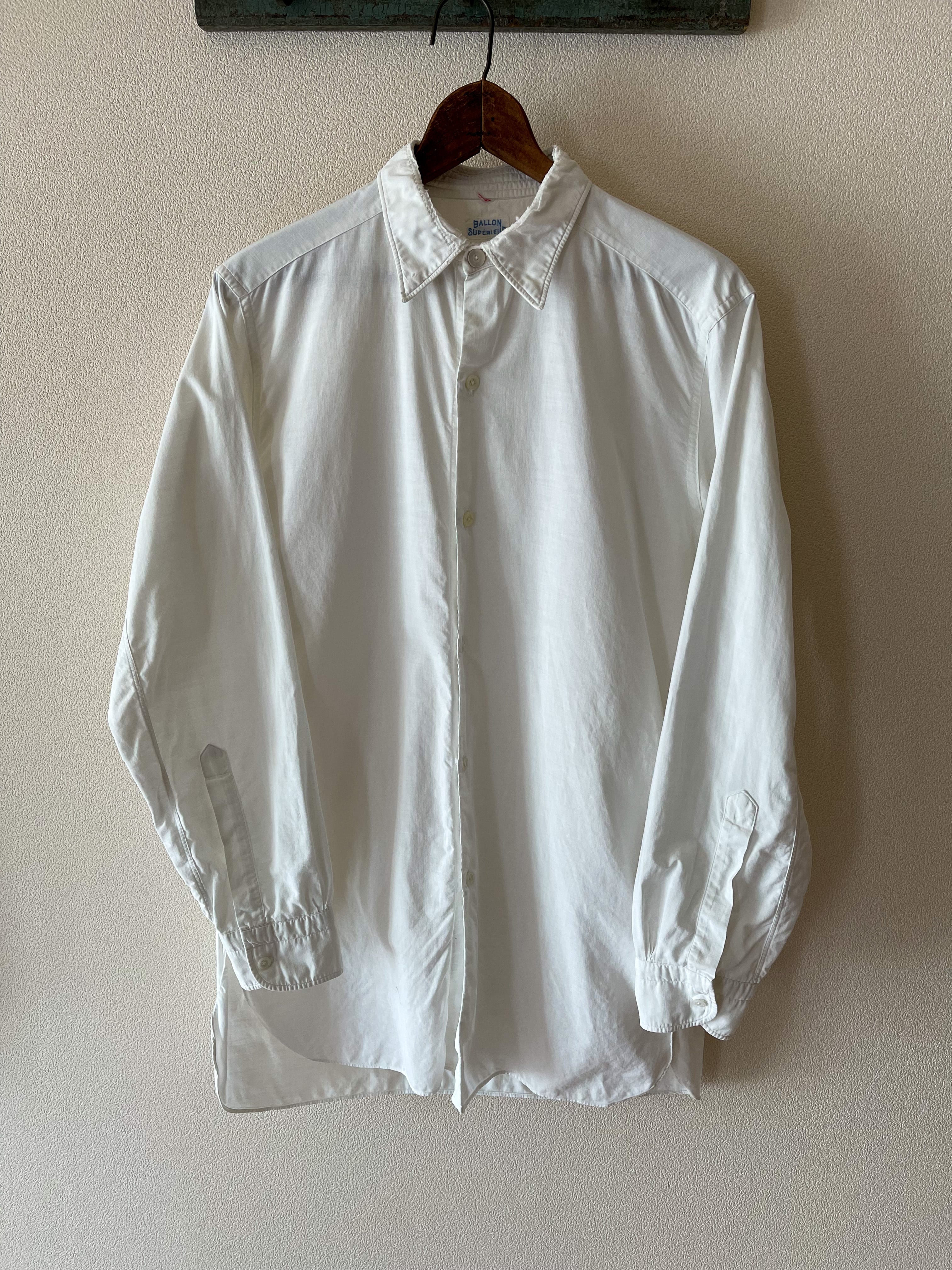 小ぶりな襟やガラスボタン、古いシャツによくあるディティール。