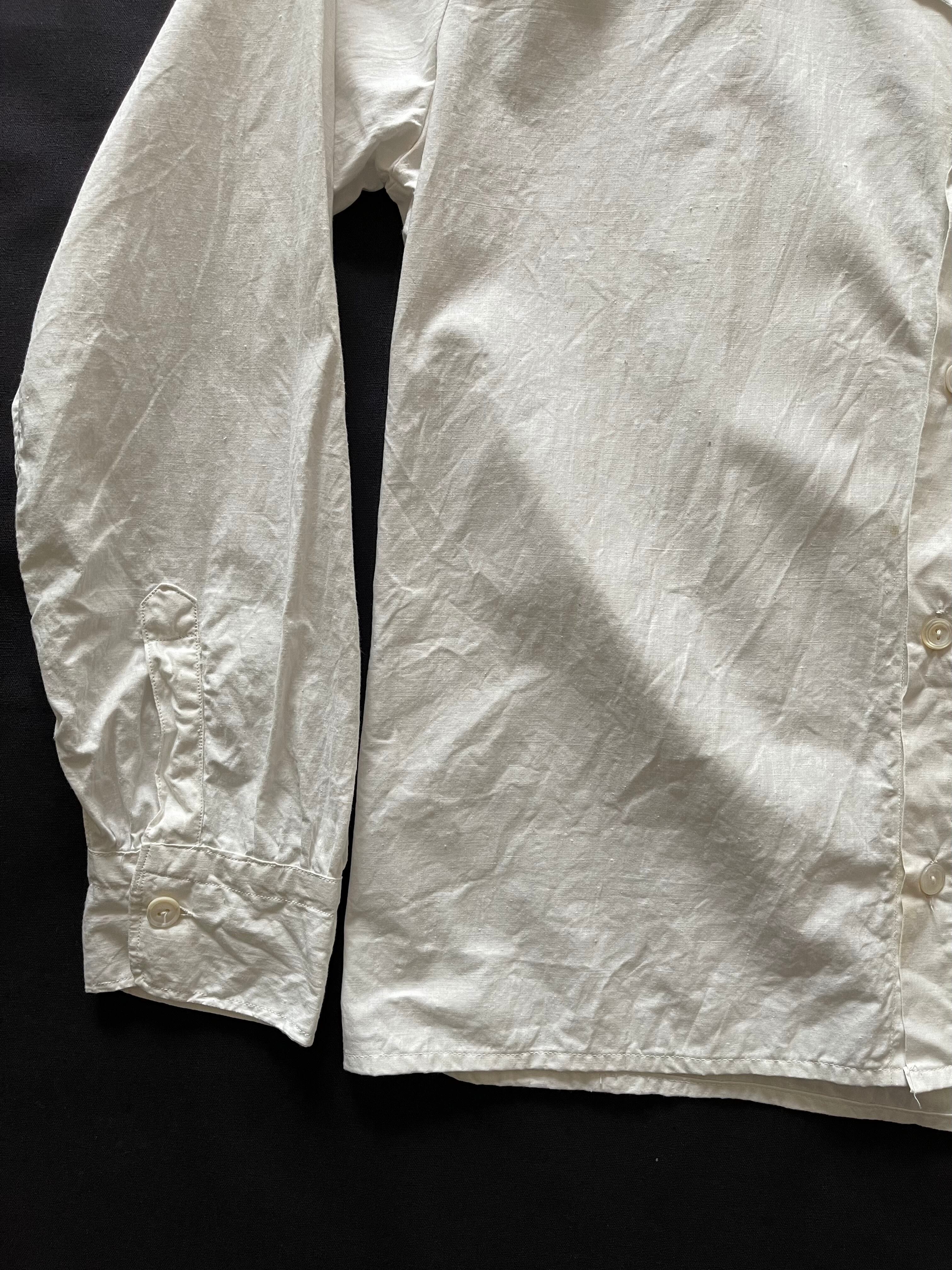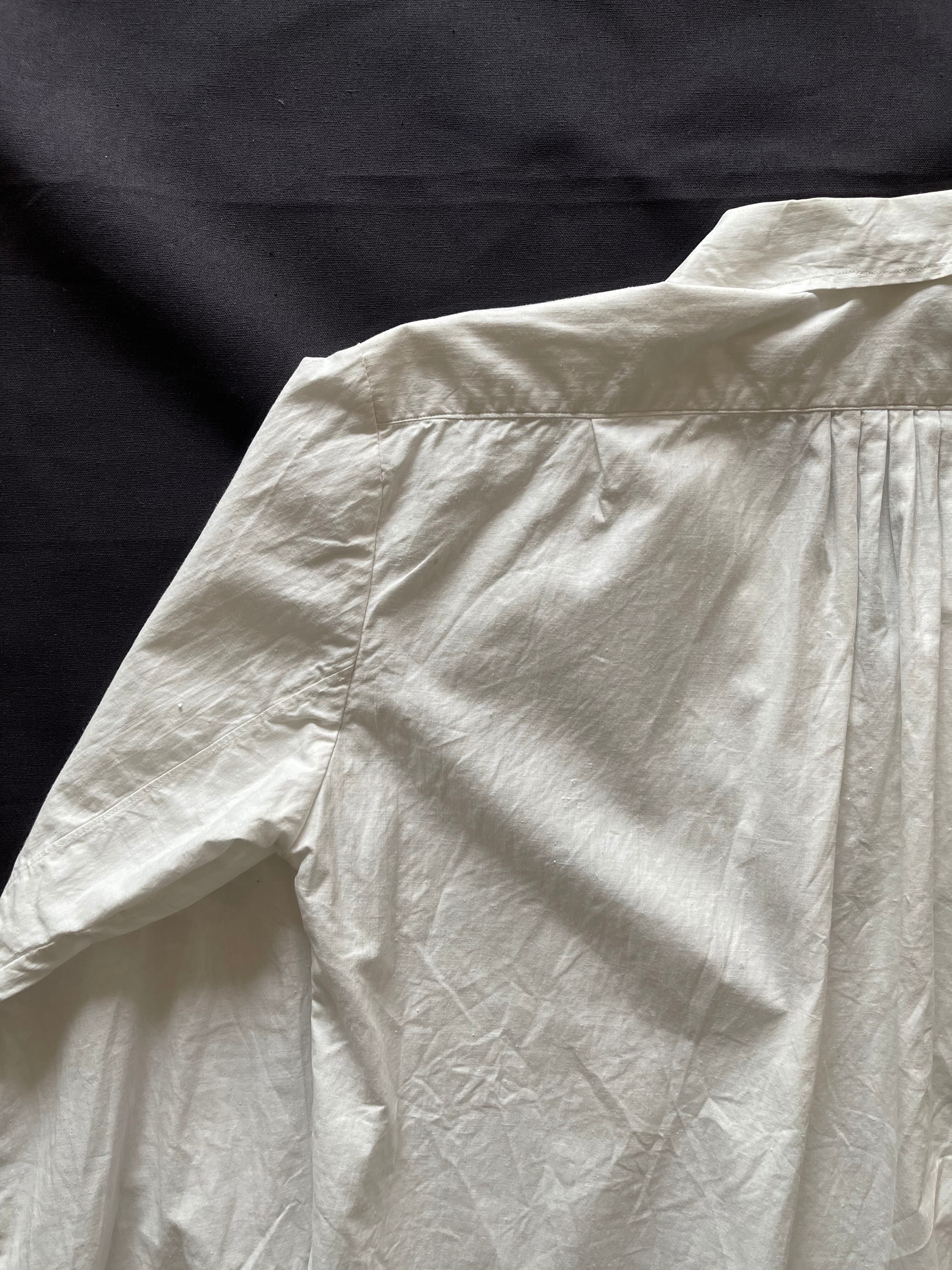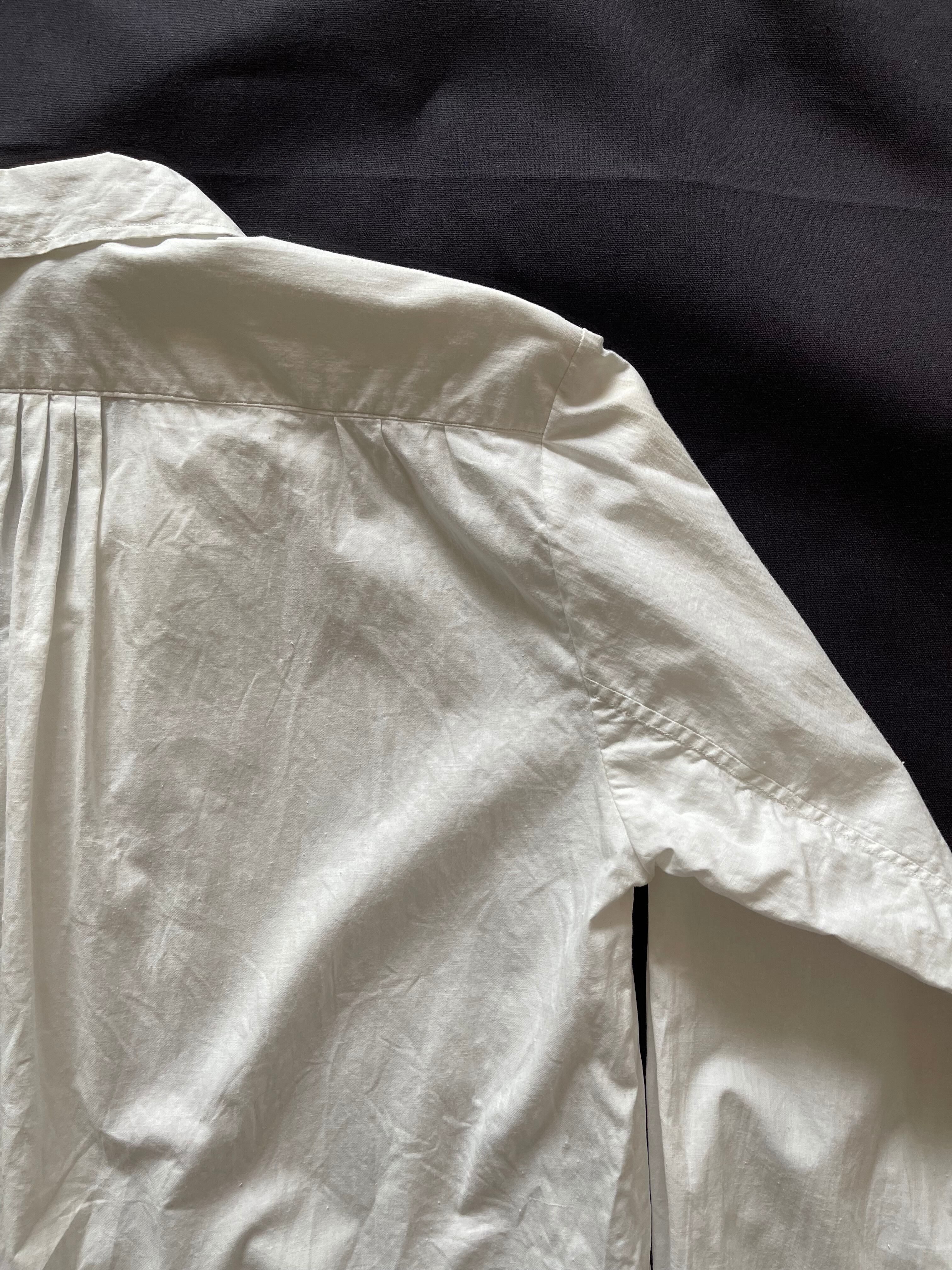 ヴィンテージ服らしいシャリのある生地感。古いボタン、胸の刺繍、バックにはギャザーが入り嬉しいポイント。着丈は前身頃が短く、着用した際にはシルエットが可愛らしくなります。