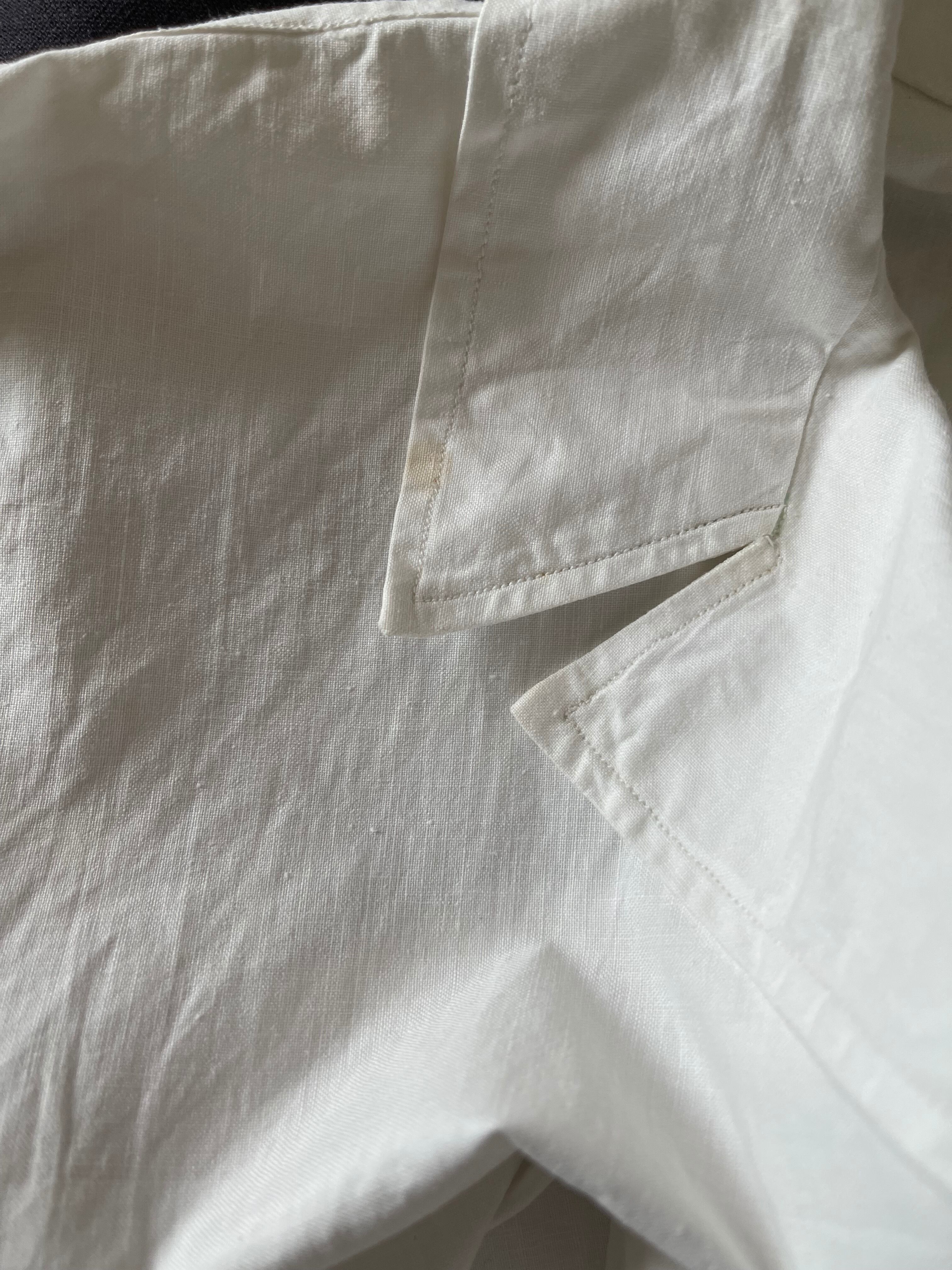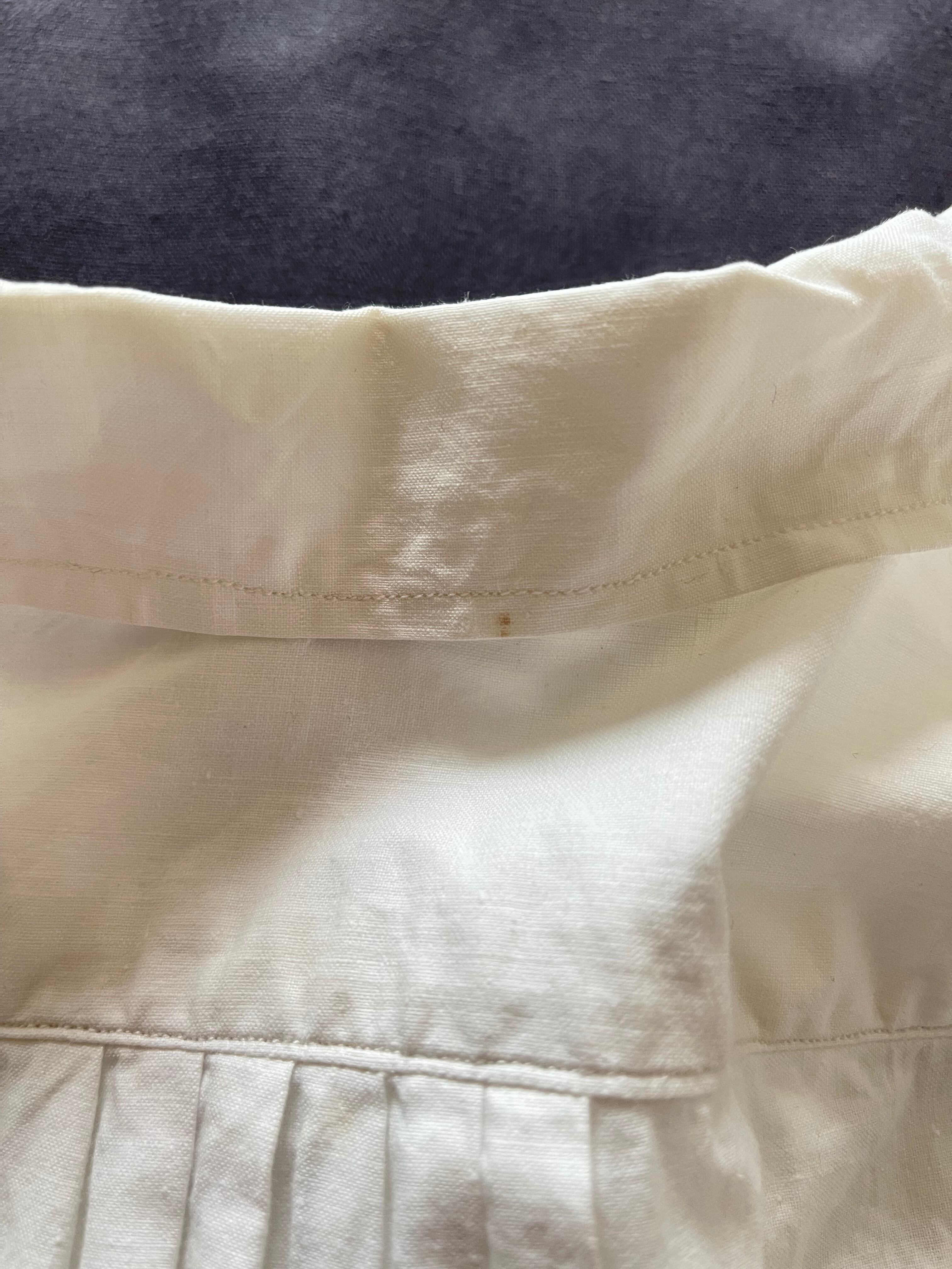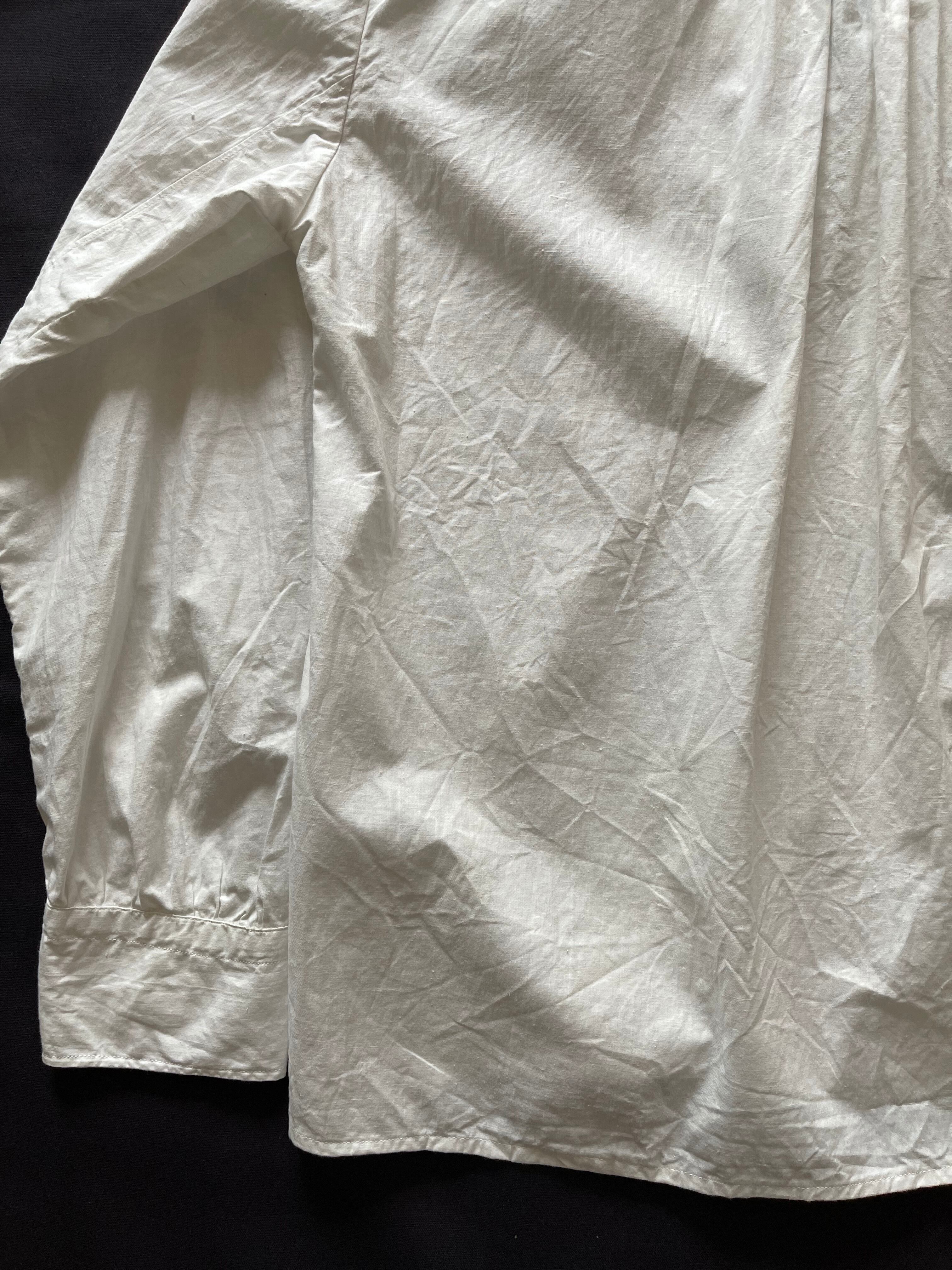 ヴィンテージ服らしいシャリのある生地感。古いボタン、胸の刺繍、バックにはギャザーが入り嬉しいポイント。着丈は前身頃が短く、着用した際にはシルエットが可愛らしくなります。