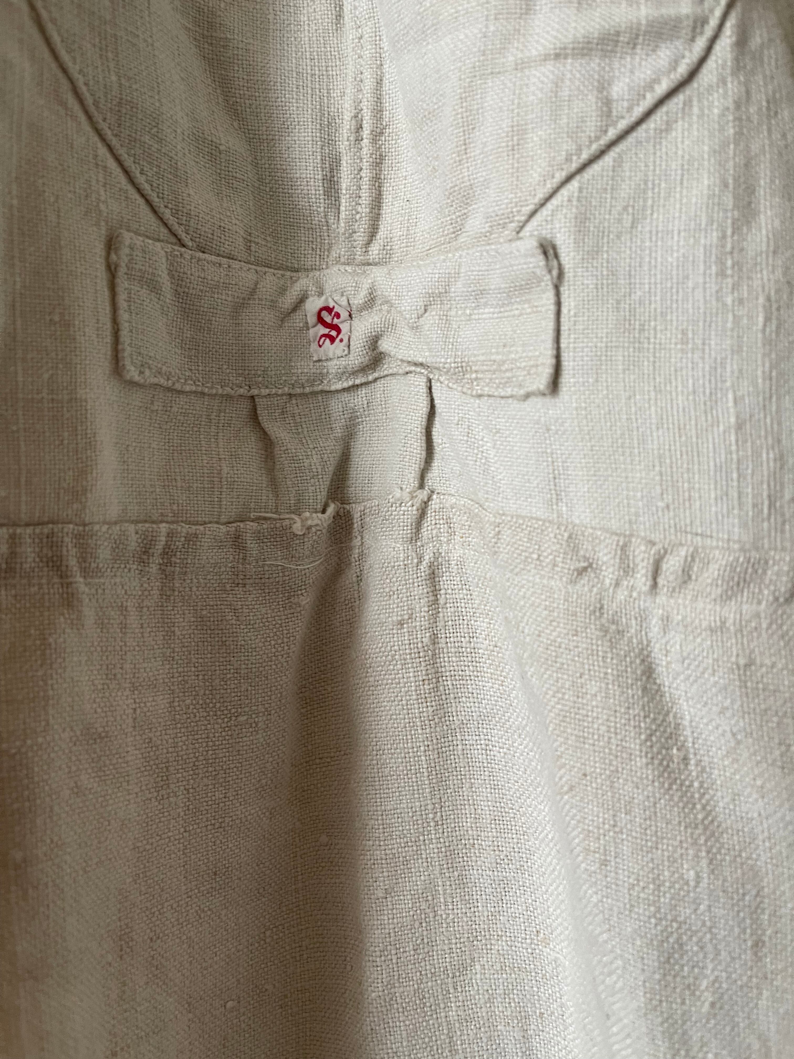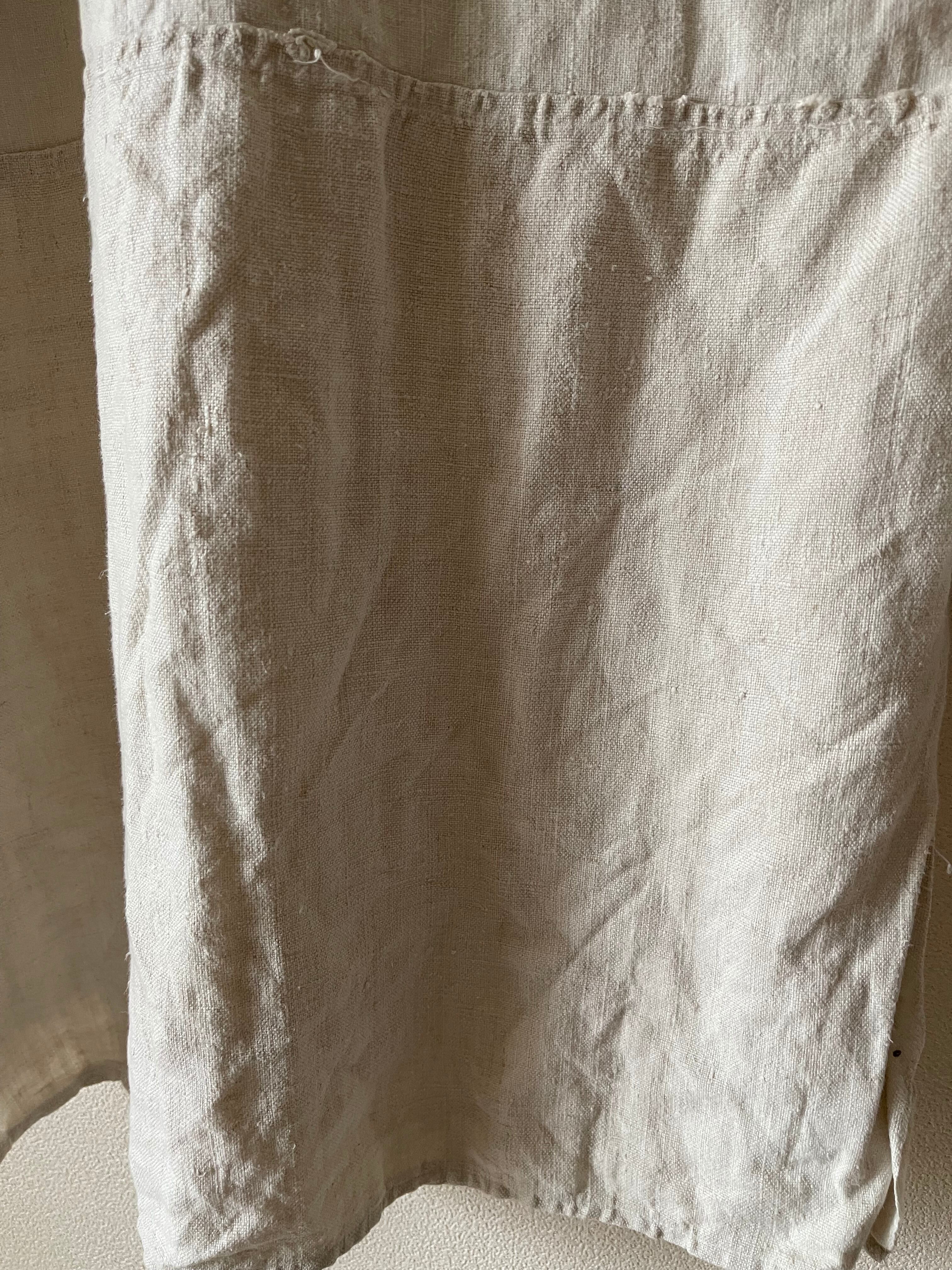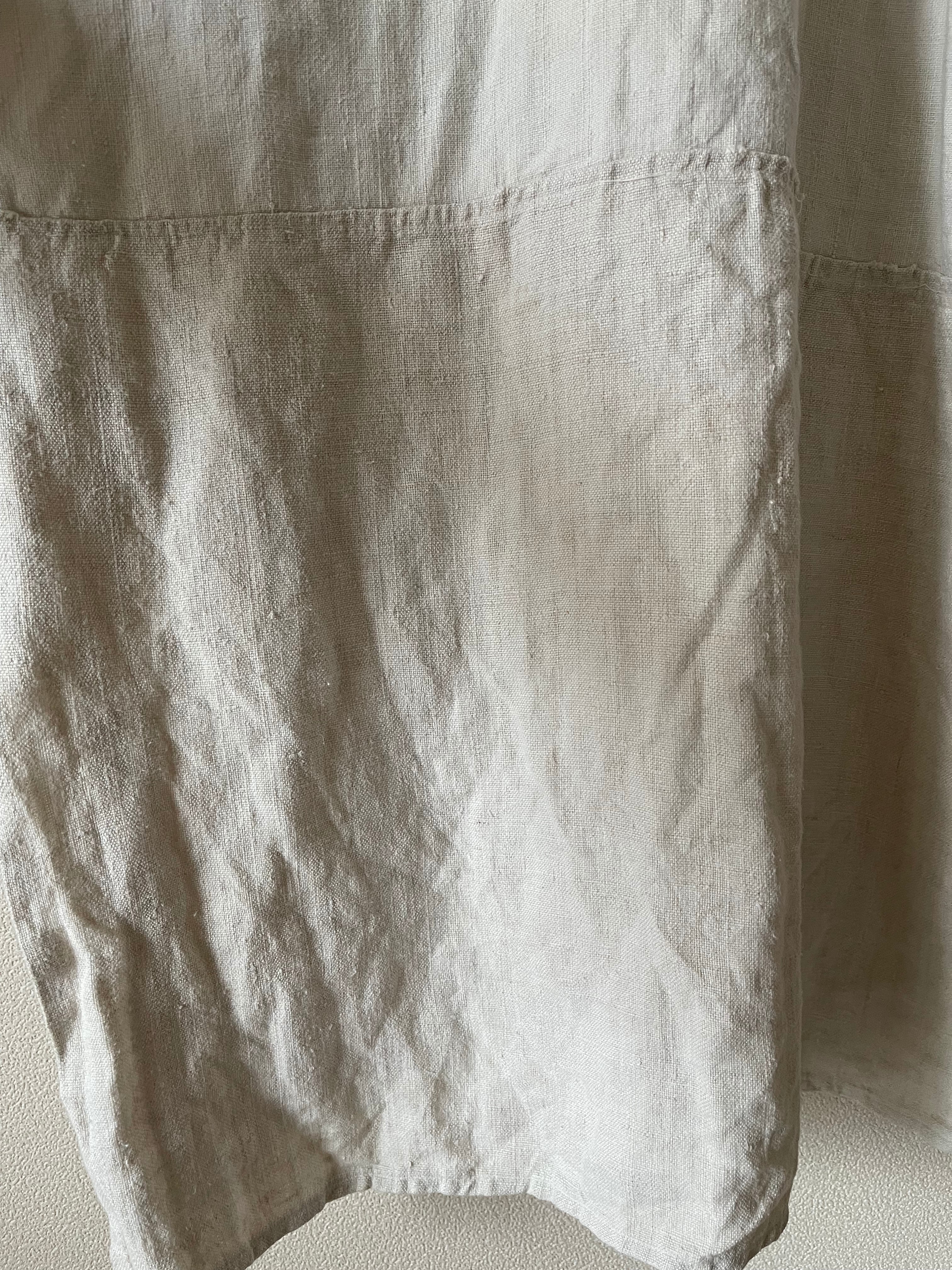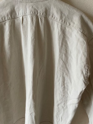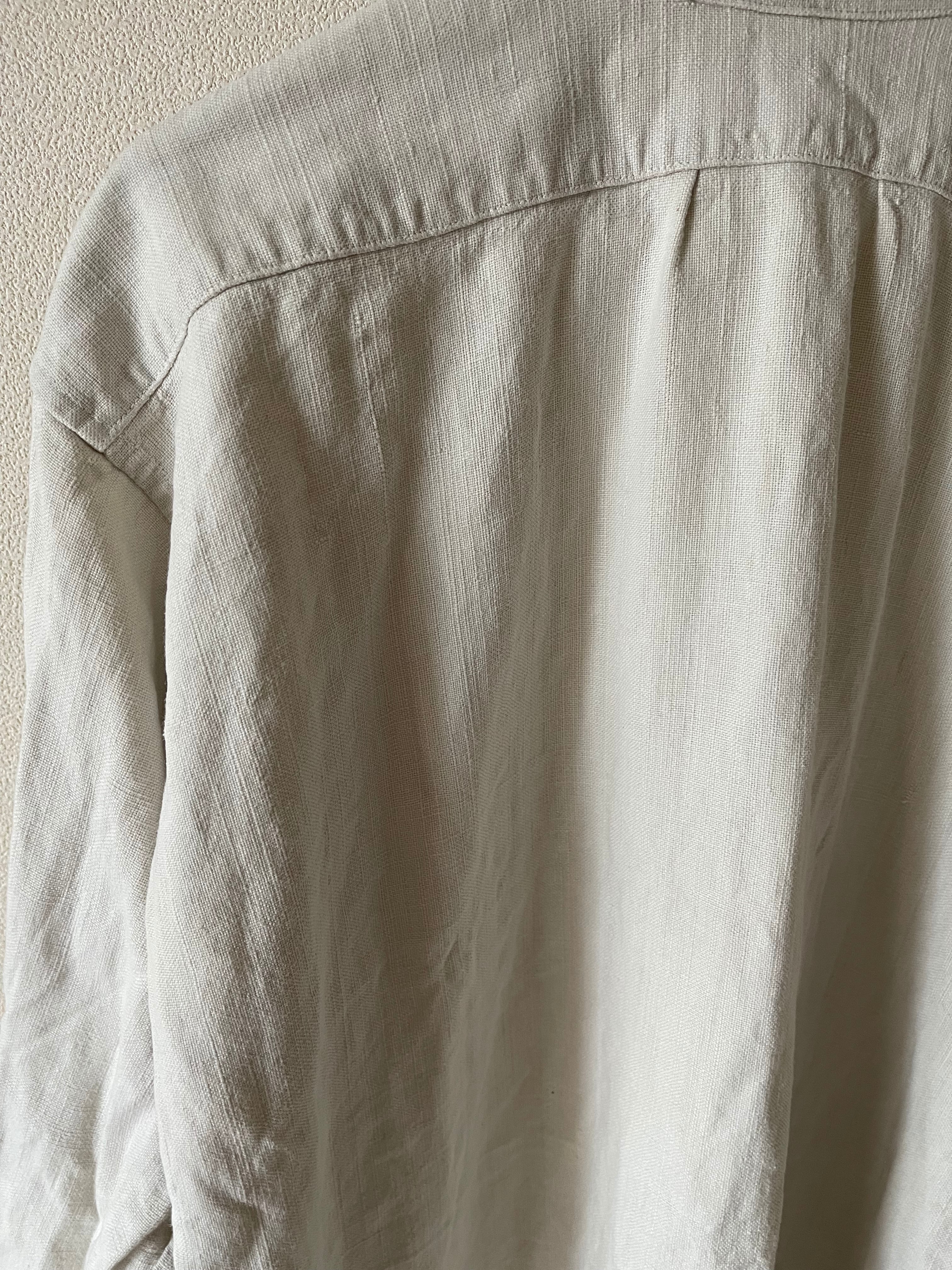 リネン特有のプルプルとした生地感。ボタンはシェルボタン。上から着用するグランパシャツです。