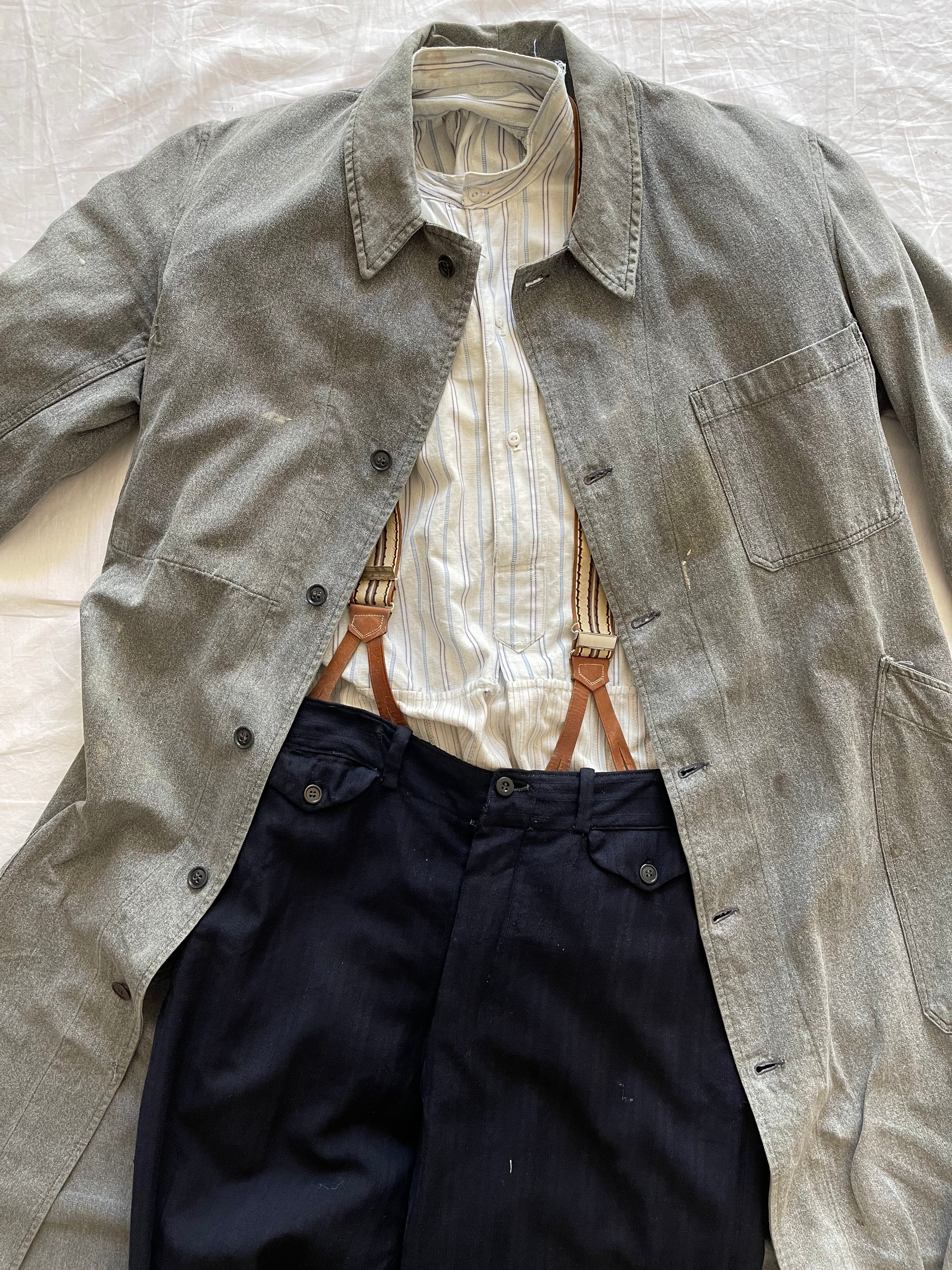 古いパンツにあるサスペンダーボタン、フロントポケット上部についたフラップ付きのコインポケット。