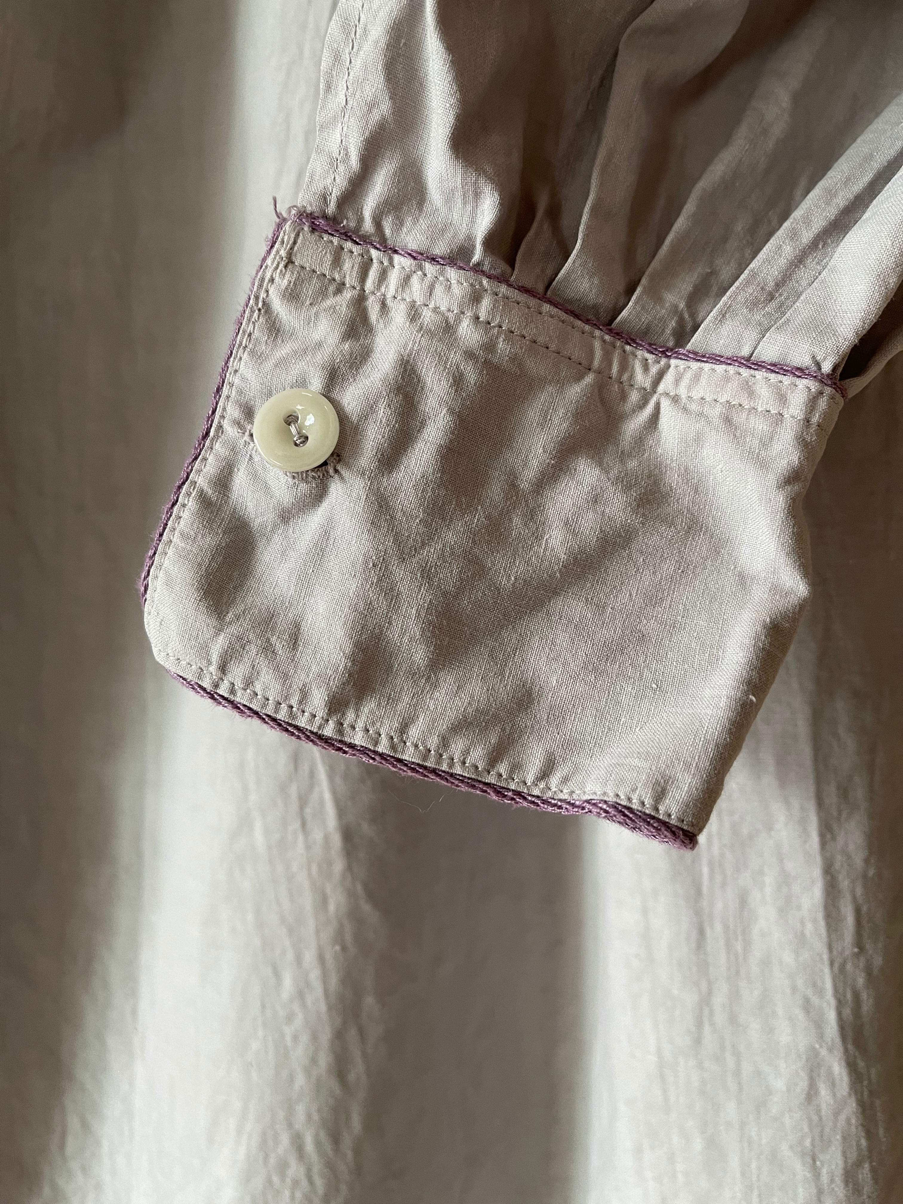 ガシっとしたリネンの生地、グレーのようなカラーになっています。パイピング部分はパープルカラー(おそらくパイピング部分はコットン)。