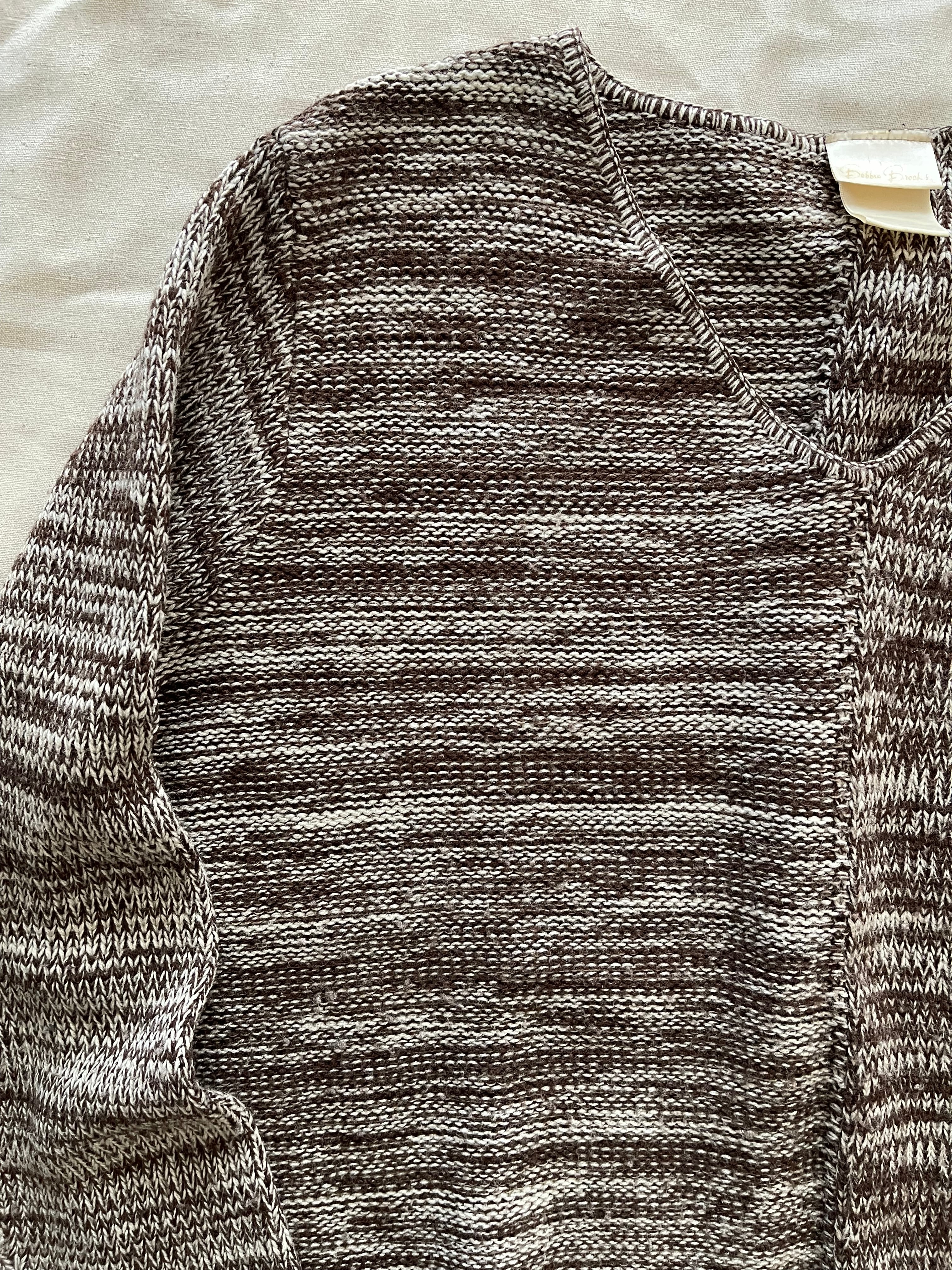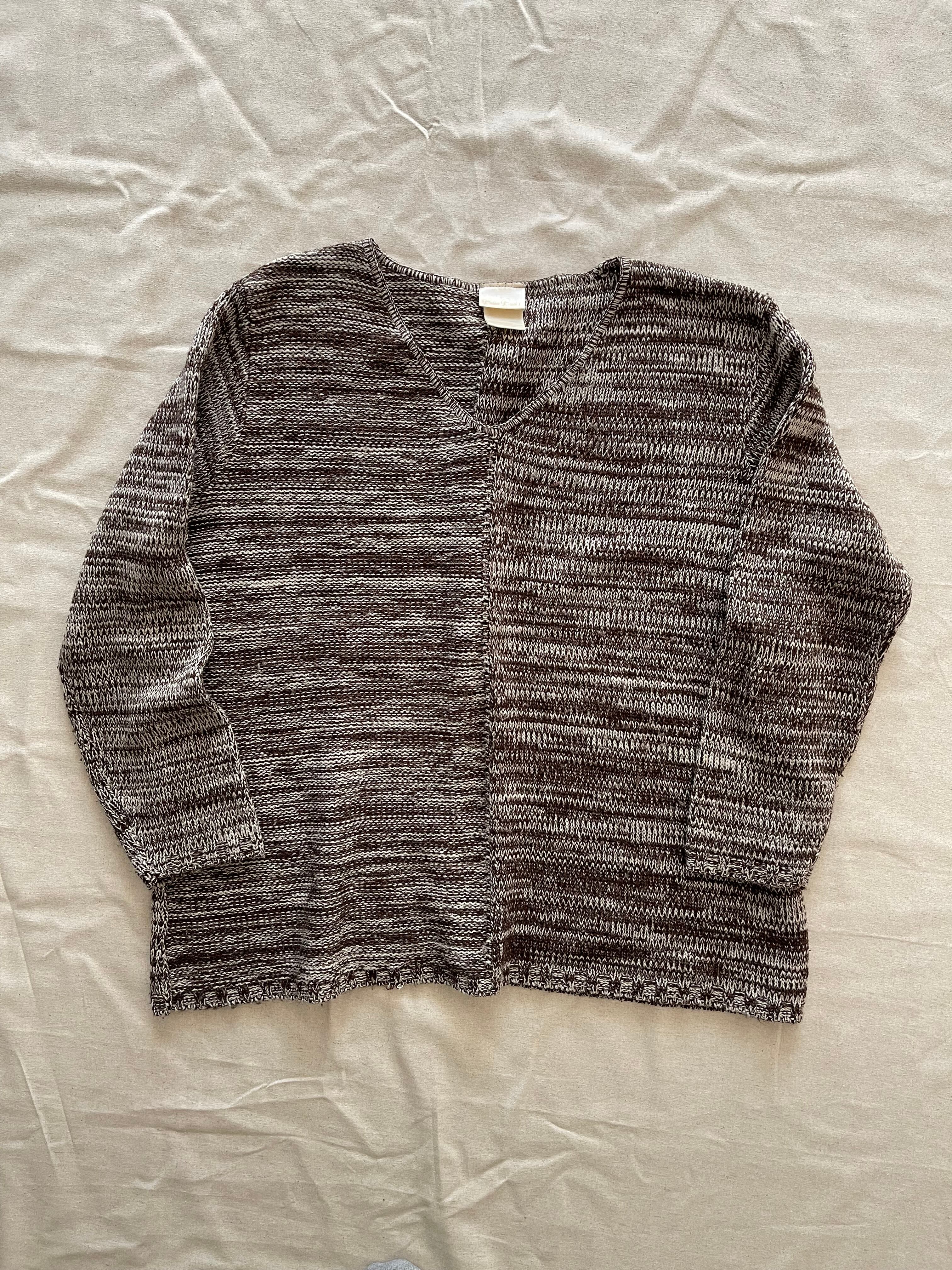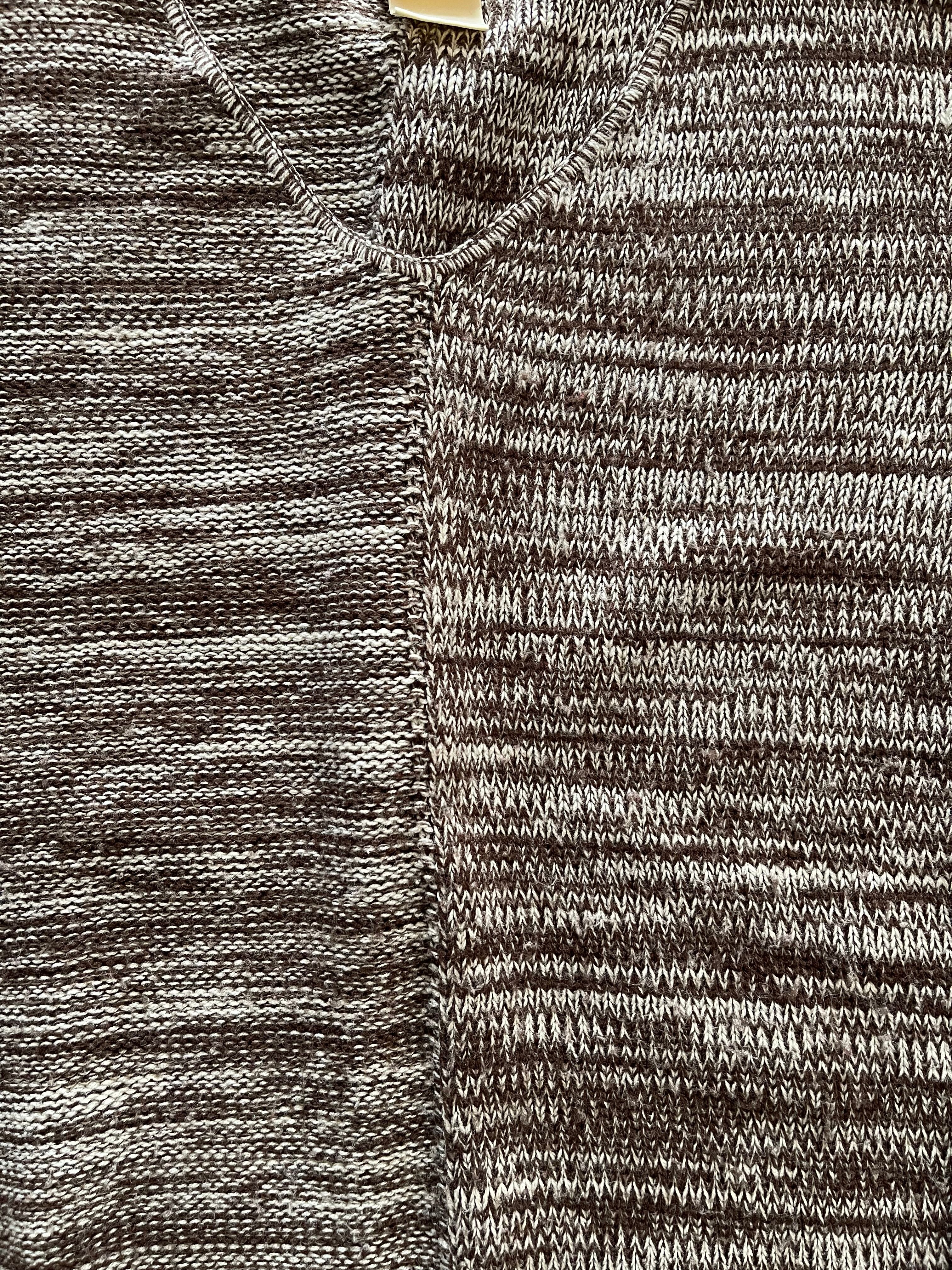 V型ネックでやや薄手、素材は表記が消えてしまっているため不明ですがウールとアクリルの混紡かと思います。チクチク感は有りません。