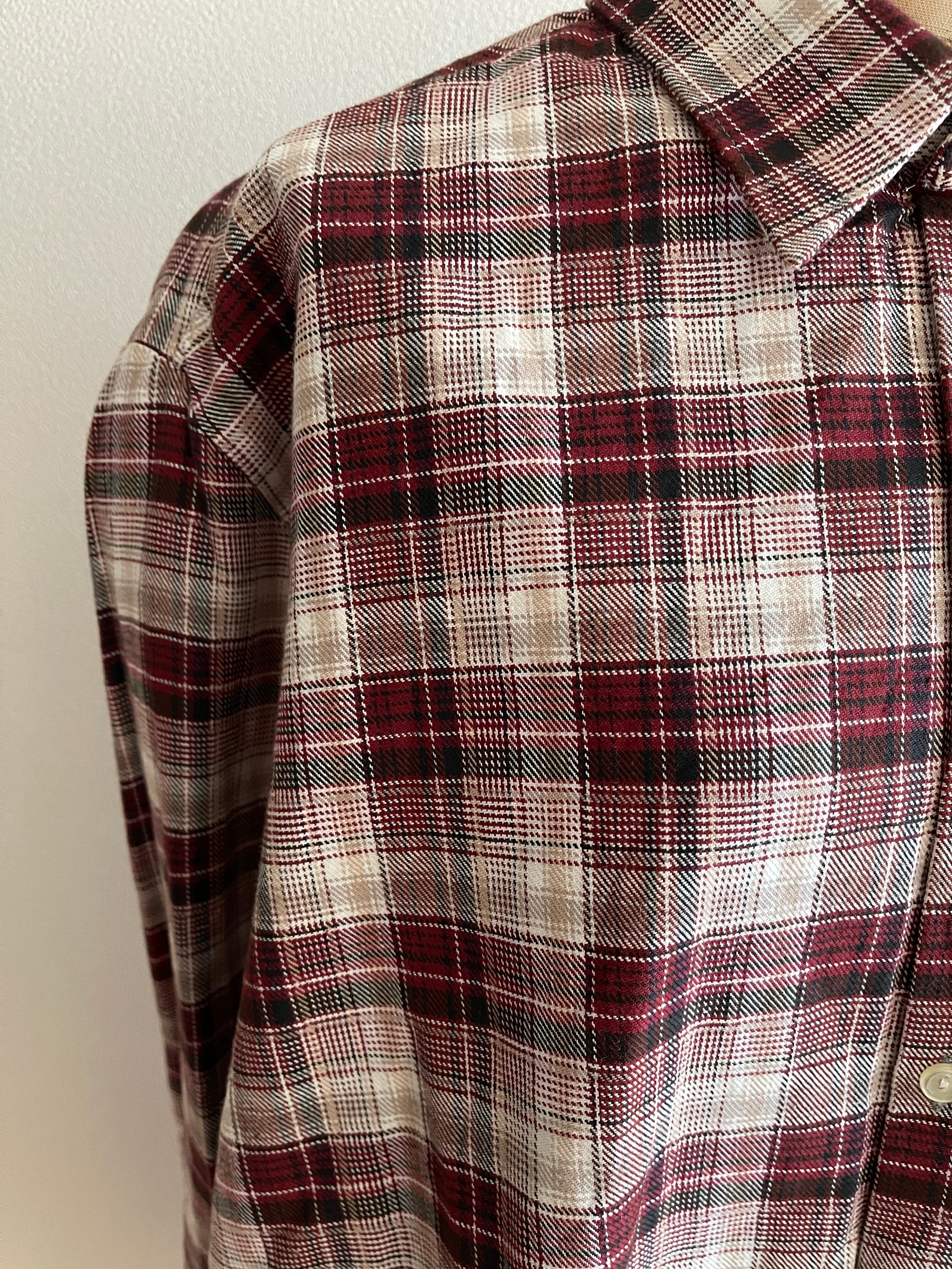 エンジ色や白など複数の色味がかったチェック柄で、合わせやすいカラーリングです。