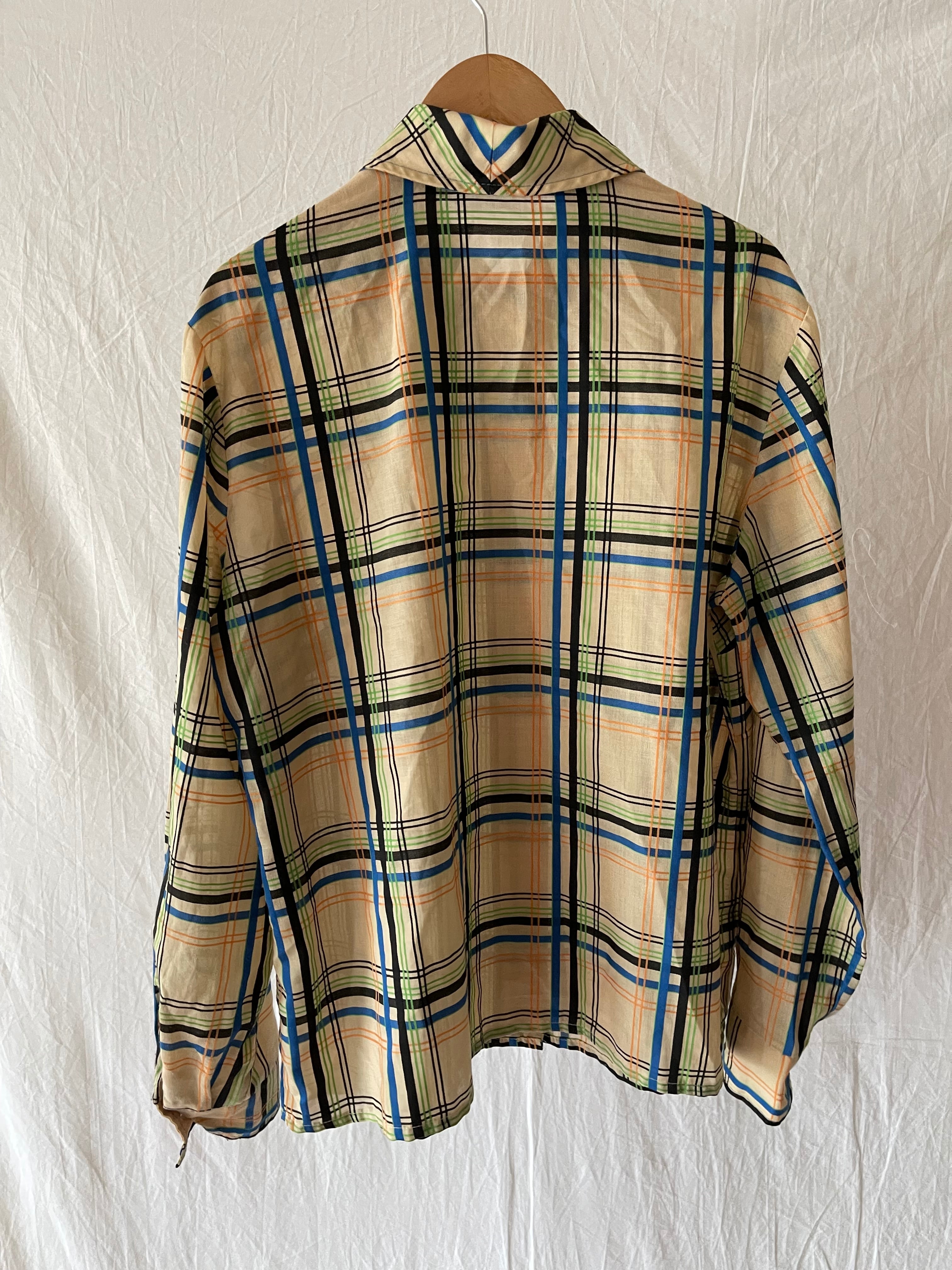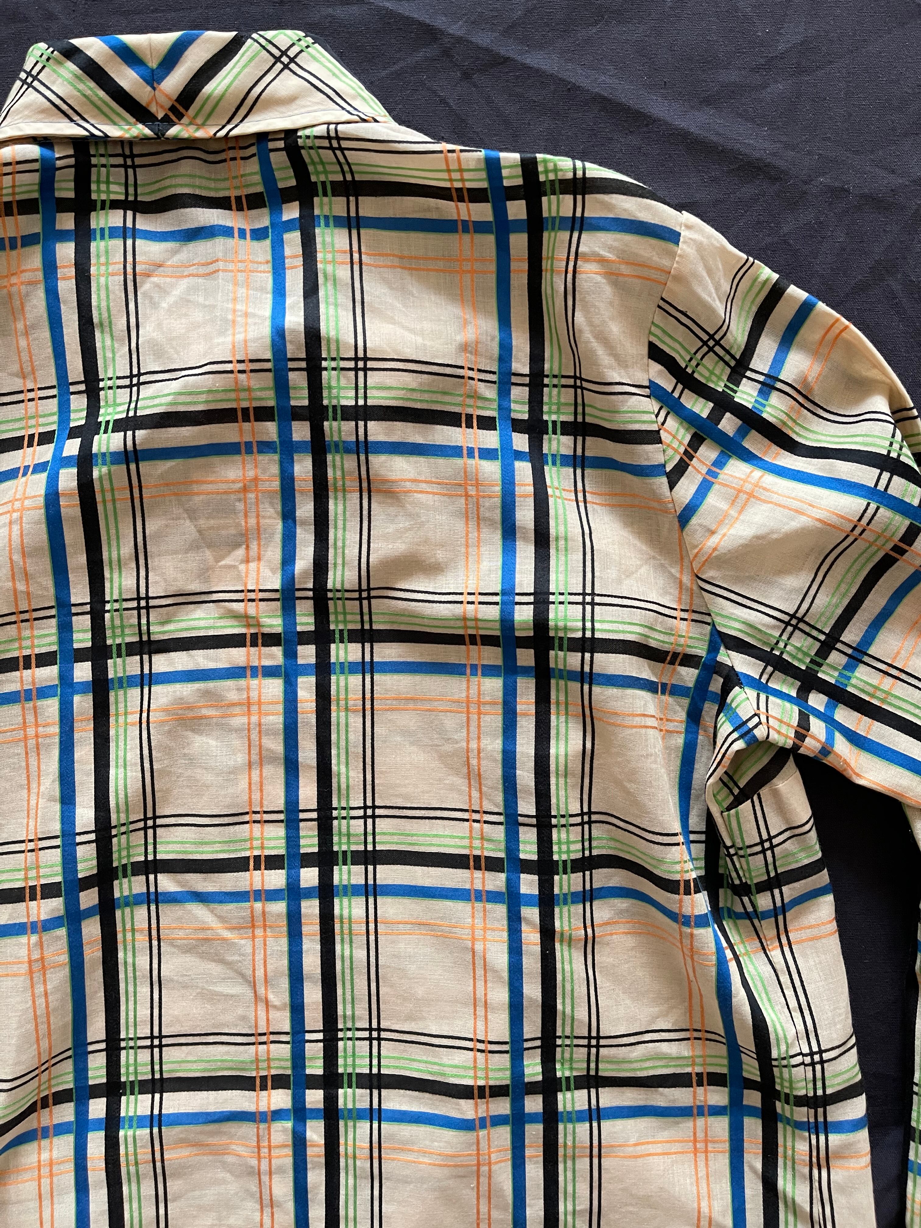 大きく特徴的な襟やボタン、生地は薄手で夏向けの生地感。フロントの合わせはレディースですが男性でも着用できるサイズです。